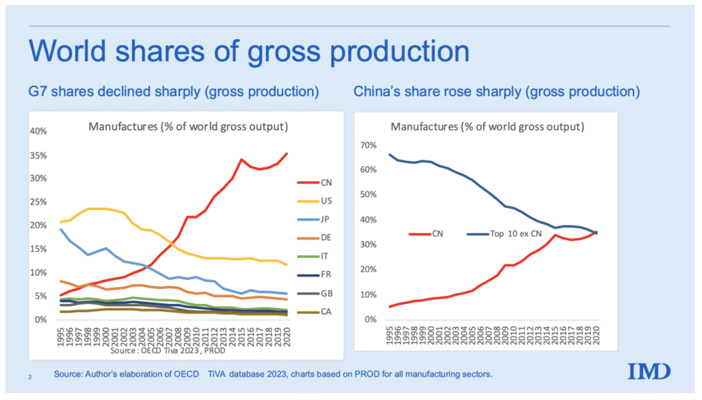 У ствари, док се Сједињене Државе и њихови НАТО савезници у Европи смањују — то су деиндустријализоване, неолибералне, постиндустријске економије — већина раста светске производње, прерађивачког рада и трговине догодила се у Кини, заједно са контролом над рафинирањем сировина, као што су ретки земни елементи, али и кобалт, чак и алуминијум и многи други материјали у Кини.